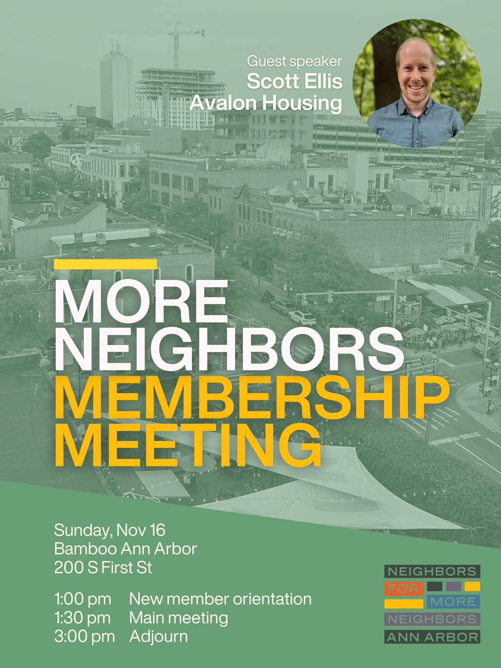 Join us for our monthly membership meeting at Bamboo (200 S 1st St, Ann Arbor, MI 48104). If it's your first meeting, join us at 1pm for a new member orientation. If you're a returning member, the main meeting will start promptly at 1:30pm. Plan on being there 5 minutes early so we start on time. Our guest speaker this month is Scott Ellis from Avalon Housing.